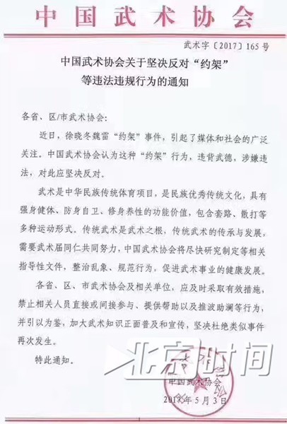 中国武术协会的工作人员则告诉北京时间“此刻”(微信号:btimenow),协会的通知并非“全面叫停”约战。通知只是要求协会的会员不参与其中,但徐晓冬和一些“约架”拳师并非会员,通知也就无法进行约束。