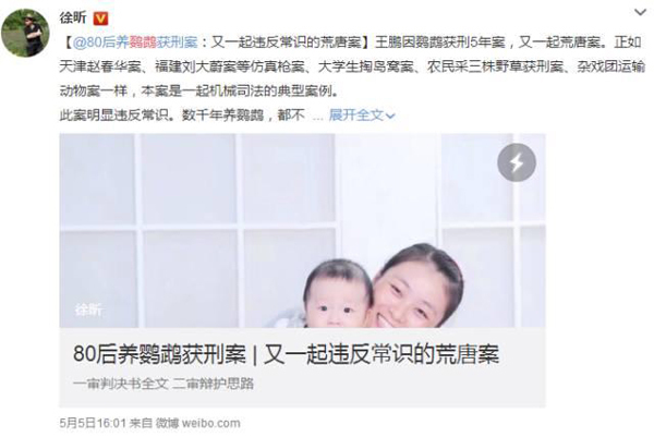 “养鹦鹉的人多,大家觉得养鹦鹉犯罪有点超乎想象。”徐昕接受记者采访时说,“一方面我们需要保护野生动物,一方面也不能脱离人性、脱离实际,我们希望通过这个案件寻求一个制度上的平衡。”